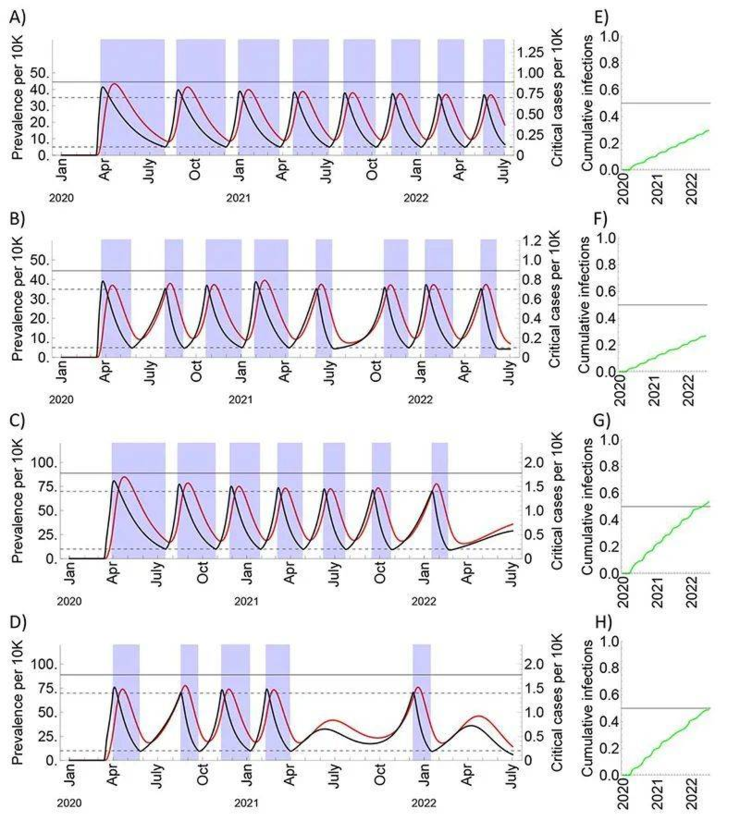 A和C无季节性影响,B和D有季节性影响,蓝色阴影区域表示间歇性社交隔离,黑色曲线表示SARS-Cov-2患病率,红色曲线表示SARS-Cov-2危重病例,黑色实心横线表示重症监护能力,水平虚线表示社交隔离的开/关阈值