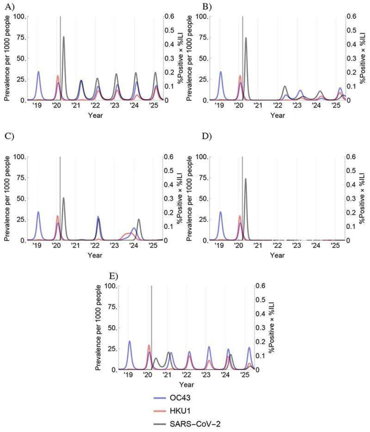 研究人员假设最坏的情况是两种 HCoV 病毒没有针对 SARS-CoV-2 的交叉免疫,这使得 SARS-CoV-2 模型不受那些病毒的传播动态影响。