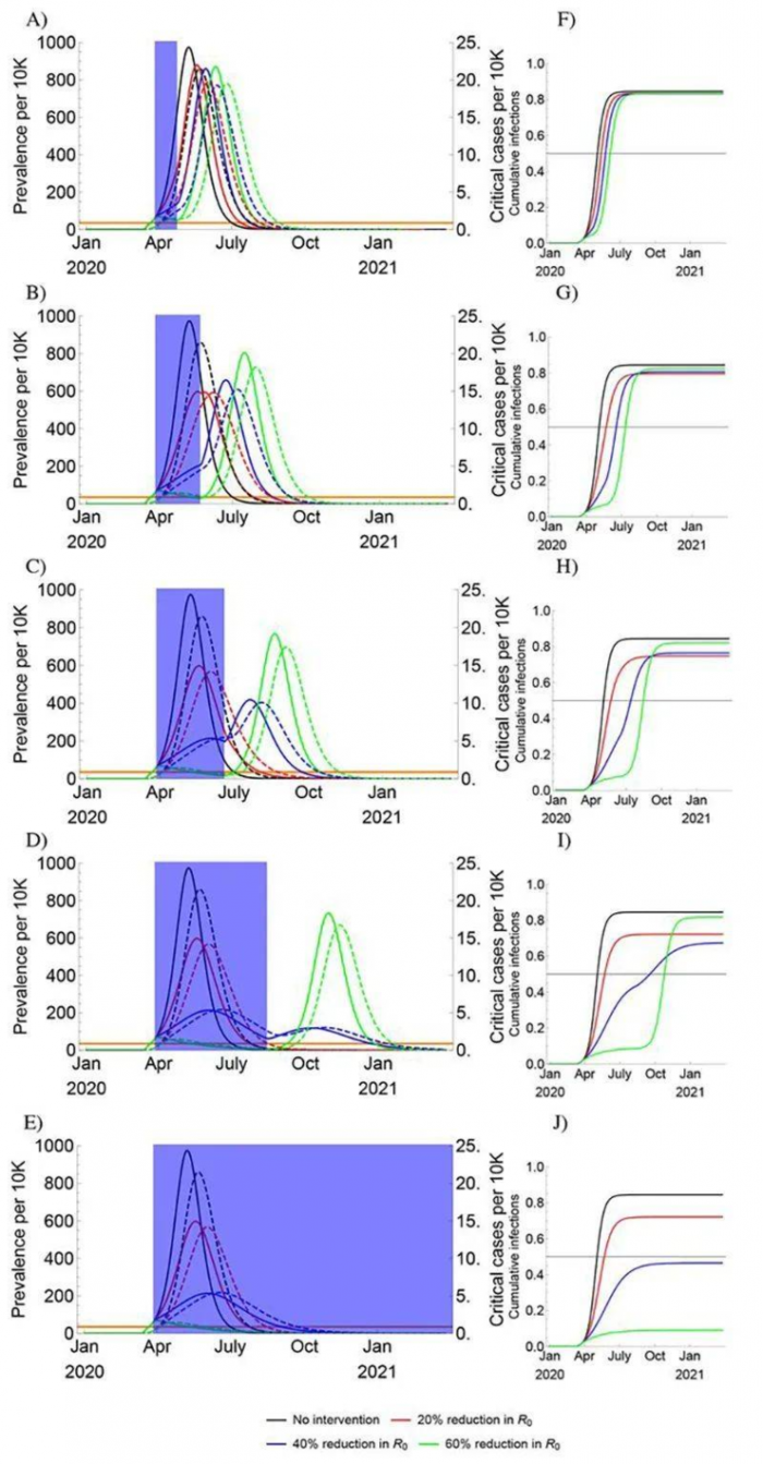 蓝色阴影区域表示社交隔离,A~E的社交隔离时间分别为4周、8周、12周、20周、无限期;R0值恒为2.2,每个患病率图旁边显示了累积感染的规模(F到J)