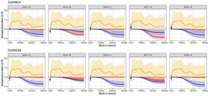 红色HCoV-HKU1发病率、蓝色为HCoV-OC43发病率,金色为季节性强迫