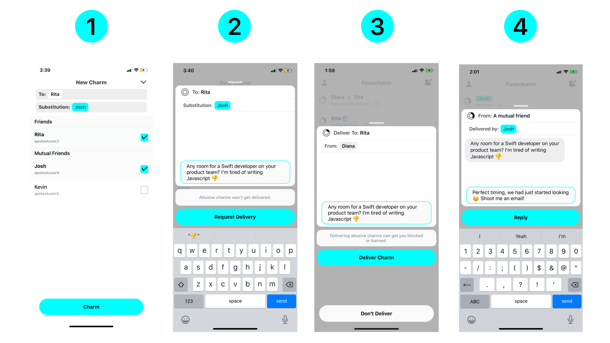Martin表示,他在五年前就对学习Swift编程产生了兴趣,但直到去年,他才决定创建一个名为Facecharm的应用。他的想法是让用户可以发送匿名信息,不是直接给对方发信息,而是通过第三人进行中间对话。基本上,就像你通过另一个人给别人发信息一样,但现在是用数字方式。
