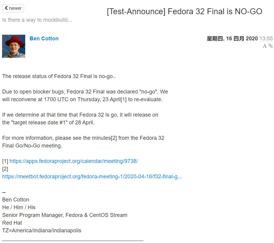 Fedora 32 原计划于下周正式发布,但目前由于一些 bug 的存在,发行计划将被暂缓。在前两天进行的发布管理会议后,Fedora 高级程序经理 Ben Cotton 发邮件通知此次发行状态为 NO-GO,也就是不可行的。当前的阻止程序错误(blocker bugs)包括 Fedora 的 “rescue mode” 无法识别 LVM 分区以及 F32 后台版本还不稳定。
