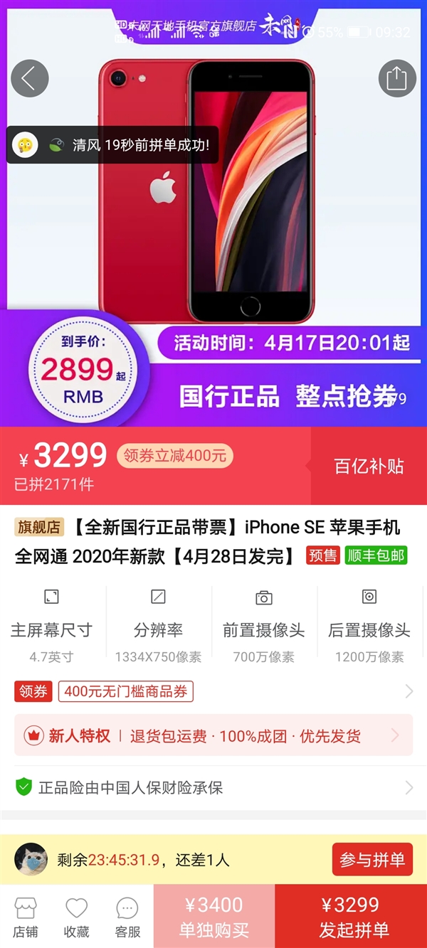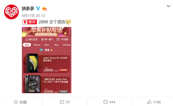 4月8日晚,全新的iPhone SE发布。苹果官网文案写到“升级到iPhone SE,理由多多。”对此,拼多多官微表示“多多…被疯狂暗示”。随后,拼多多的预约界面也显示“惊喜价”。昨晚8点,新iPhone SE正式开启预售。拼多多如约兑现承诺:新iPhone SE降价400元,只要2899元即可到手。