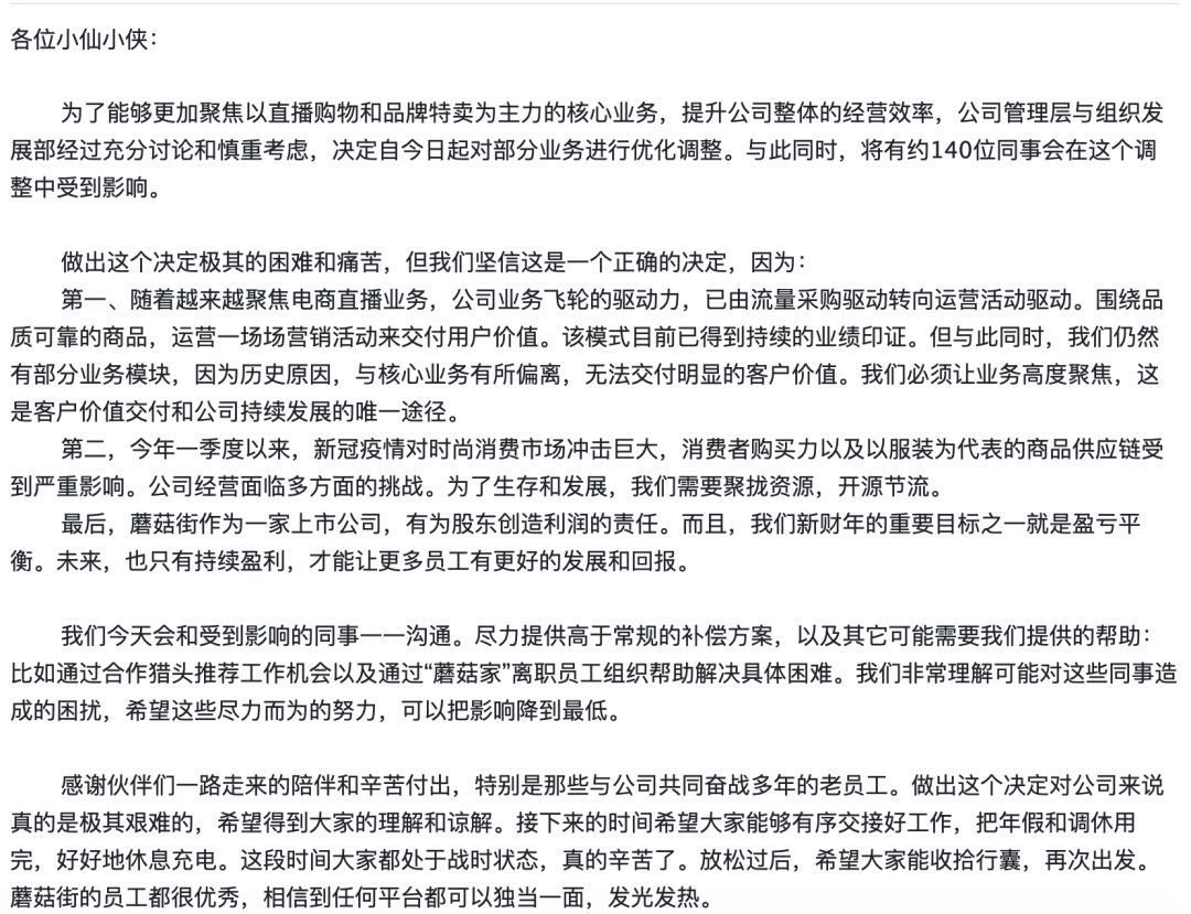 人员优化首先是基于业务结构的正常调整。2020年第一季度,我们对业务模式有了调整,在原有源头好货,以及搭配好货的基础上,可以看到有更多更好的品牌货与主播产生了化学反应,这使蘑菇街坚定了更加聚焦直播电商行业的决心,所以优化掉部分非强相关业务,导致本次裁员的发生。曾在蘑菇街工作过的员工都很优秀,我们非常感谢他们在公司发展进程中的贡献,也已经联合猎头机构帮助员工定向推送,祝愿他们未来会做的更好。