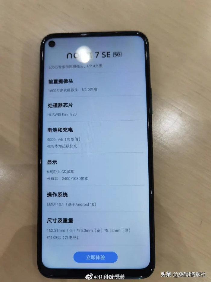 华为将于4月23日发布nova 7系列。本次发布会预计会推出三款nova新品,包含nova 7、nova 7 Pro和nova 7 SE。4月18日消息,有博主曝光了nova 7 SE真机照。如图所示,nova 7 SE延续了上一代的挖孔屏方案,其屏幕尺寸为6.5英寸,材质为LCD,分辨率为2400×1080,疑似采用侧面指纹识别。