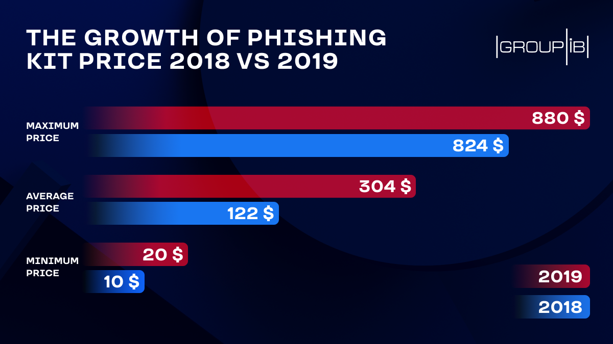 从事网络安全研究的Group-IB表示,该公司通过分析汇总已知的网络犯罪市场和黑客论坛上发布的交易数据,2019年网络犯罪黑市上出售的网络钓鱼套件的平均价格从2018年录得的122美元飙升至去年的304美元。