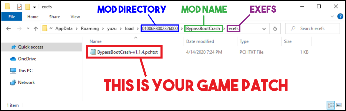 3.下载这款补丁,复制到《动物森友会》在Yuzu下的“mod”文件夹下。只有打了这个补丁才能度过启动崩溃。右键点击游戏列表中的《动物森友会》,点选“打开MOD数据文件夹”,然后把补丁复制到文件夹中,格式如图: