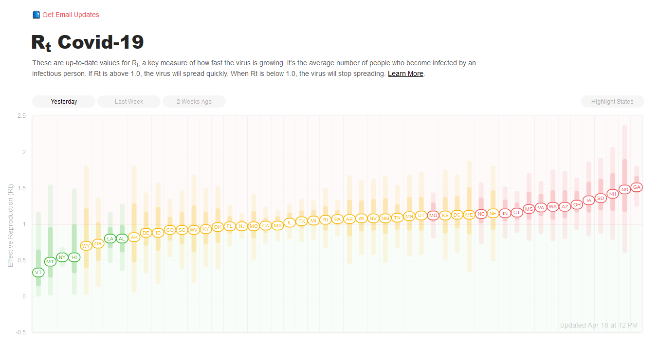 其中“Rt”衡量的是被传染者感染的平均人数。数字1以上越高,表示COVID-19在人群中的传播速度越快,而低于1的数字则表示病毒正在消退。例如,Rt.live显示,佐治亚州的Rt得分最高,最危险的Rt得分为1.5,而纽约由于积极的社交隔离令,下降到了0.54。