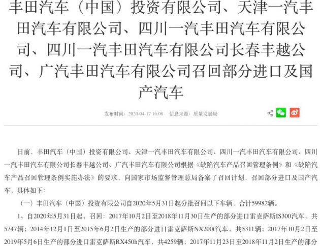 另外,丰田汽车(中国)投资有限公司、天津一汽丰田汽车有限公司、四川一汽丰田汽车有限公司、四川一汽丰田汽车有限公司长春丰越公司、广汽丰田汽车有限公司根据《缺陷汽车产品召回管理条例》和《缺陷汽车产品召回管理条例实施办法》的要求,向国家市场监督管理总局备案了召回计划,召回部分进口及国产汽车,具体如下: