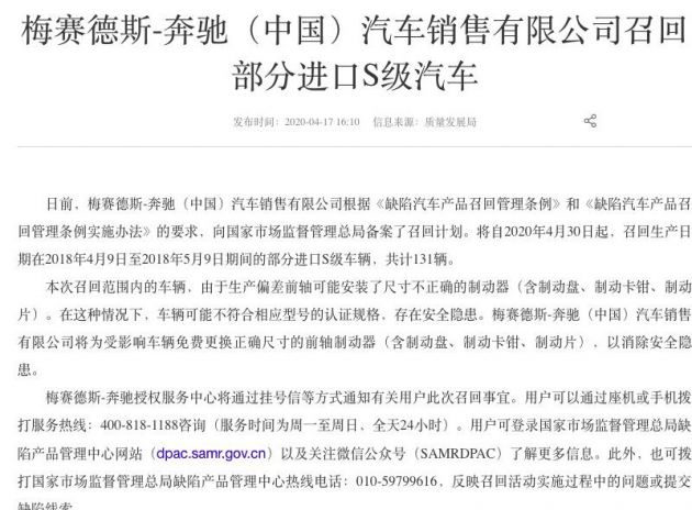 梅赛德斯-奔驰(中国)汽车销售有限公司根据《缺陷汽车产品召回管理条例》和《缺陷汽车产品召回管理条例实施办法》的要求,向国家市场监督管理总局备案了召回计划。将自2020年4月30日起,召回生产日期在2018年4月9日至2018年5月9日期间的部分进口S级车辆,共计131辆。 本次召回范围内的车辆,由于生产偏差前轴可能安装了尺寸不正确的制动器(含制动盘、制动卡钳、制动片)。在这种情况下,车辆可能不符合相应型号的认证规格,存在安全隐患。梅赛德斯-奔驰(中国)汽车销售有限公司将为受影响车辆免费更换正确尺寸的前轴制动器(含制动盘、制动卡钳、制动片),以消除安全隐患。