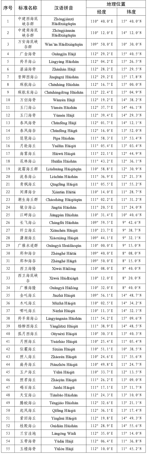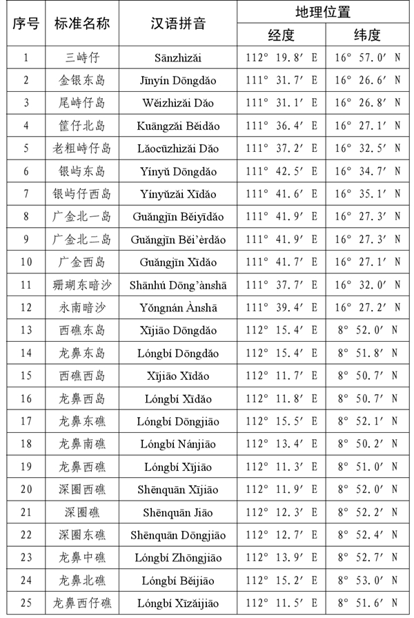 4月19日下午,国家民政部发布公告,为进一步规范有关地名的使用,公布了我国南海25个岛礁、55个海底地理实体的标准名称,请社会各界规范使用已公布的标准名称。公告还表示,中国地名委员会1983年4月受权公布的《我国南海诸岛部分标准地名》继续有效。