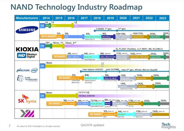 不过每家的技术方案不同,东芝、西数的BiCS 5代3D闪存是112层的,美光、SK海力士有128层的,Intel的是144层,而且是浮栅极技术的,三星去年推出的第六代V-NAND闪存做到了136层,今年也是量产的主力。