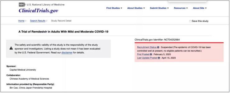 4 月 15 日,临床试验注册网站 ClinicalTrials.gov 显示的信息,瑞德西韦在中国进行的两项临床试验,包括针对重型患者和针对轻型、普通型患者的两项试验,都更新了最新状态,为 "暂停"。