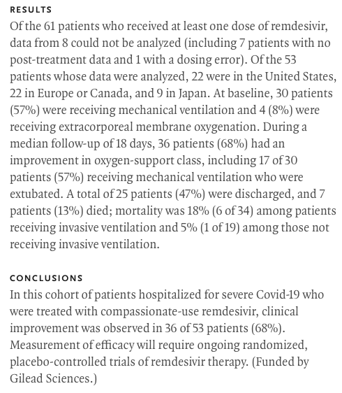 4 月 10 日,《新英格兰医学杂志》(NEJM)在线发表瑞德西韦同情用药的回顾性分析结果。其中,在纳入分析的 53 例来自美国、日本、加拿大和欧洲的重症新冠肺炎患者中,68% (36/53)的患者在氧气支持类型方面得到改善,7 例患者(13%)死亡。
