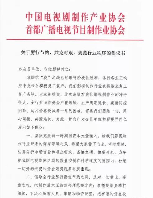 日前,中国电视剧制作产业协会、首都广播电视节目制作业协会发布《关于厉行节约,共克时艰,规范行业秩序的倡议书》(以下简称《倡议书》)。倡导全行业厉行勤俭节约之风,把制作成本压缩到合理范畴之内,把有限的资金投入到对精品的制作中。
