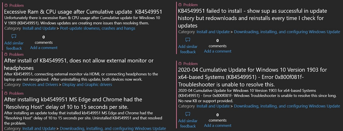 “我注意到在安装KB4549951更新后,每当尝试执行看似繁重的CPU任务时,我都会蓝屏,我进行了一些实验,发现问题似乎是新补丁造成的,其他一切都很正常。”