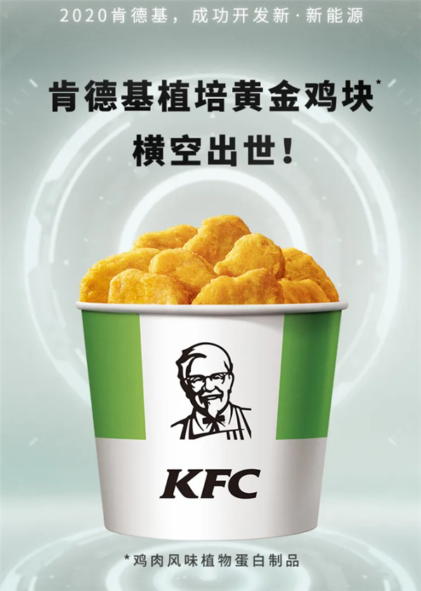 继麦当劳宣布了“5G新品”后(其实就是多汁炸鸡),肯德基之前预热的“跨界新能源”新品也亮相了,虽说也是炸鸡块,但性质不太一样,属于人造肉。肯德基官方公布的新品现实,这是植培黄金鸡块,虽说是鸡块,但是它是来自植物界,说白了就是人造肉。