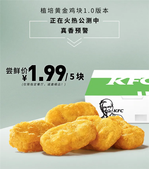 从目前公测的细节看,植培黄金鸡块公测阶段是1.99元/5块,目前接受用户预售(每个ID限购2份),月底前开始上市,不过只有上海、广州和深圳三个特定的肯德基餐厅才会届时上架。