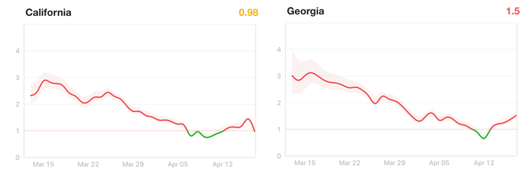 从目前的情况来看,新冠病毒传播最快的州是佐治亚州,其Rt值为1.5。新冠病毒疫情似乎受到控制的州是佛蒙特州,其Rt值为0.33。