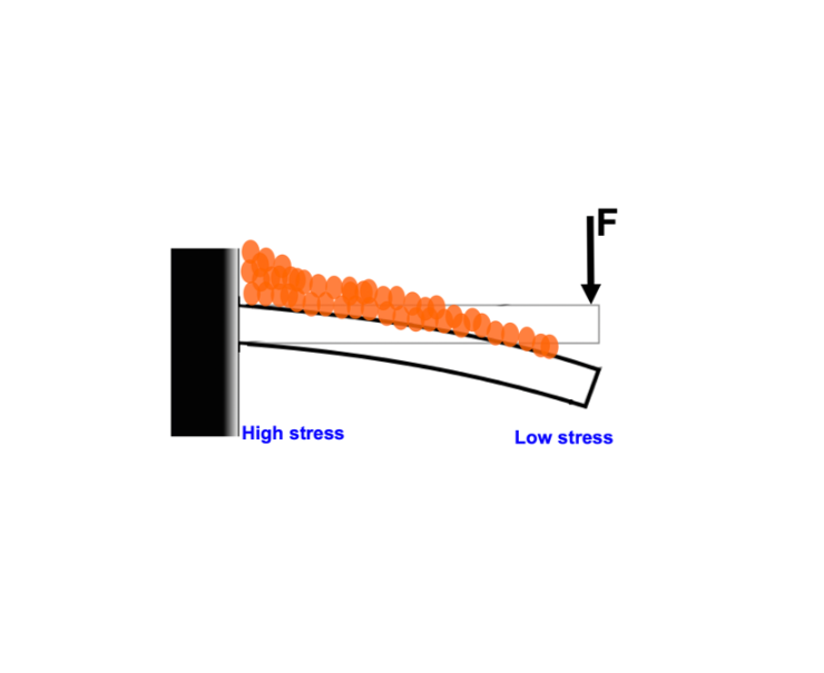 研究人员在材料表面的一端固定了一个旨在增加应力水平的光束。结果是,材料受力较大的部分在表面积聚了更多的矿物质,矿物质的高度与施加的应力成正比。