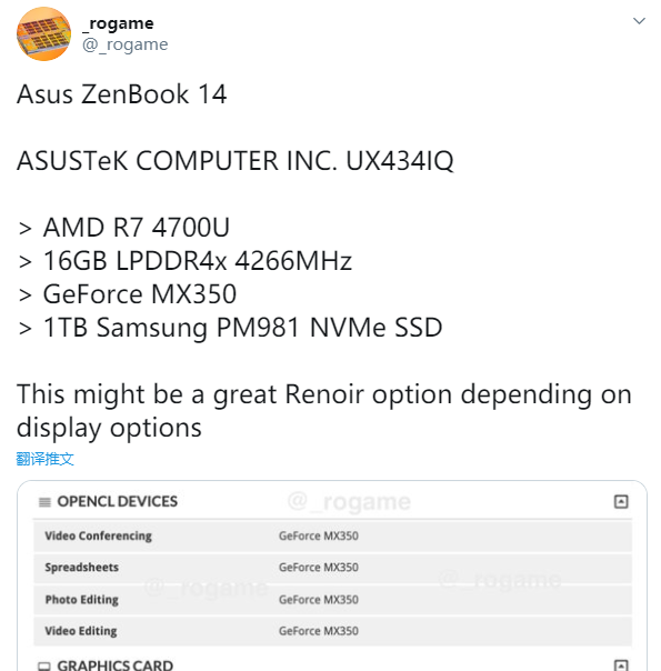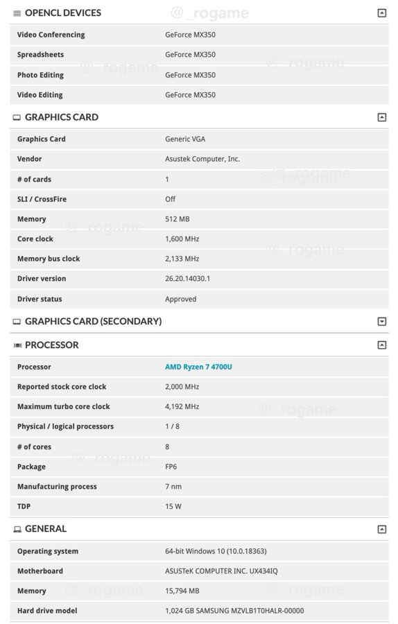 3DMark曝光的这款华硕新本编号UX434IQ,使用了一颗锐龙7 4700U,6核心12线程,8MB三级缓存,基准频率2.0GHz,最高加速4.3GHz,热设计功耗15W。