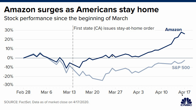 前所未有的需求将亚马逊的股价推向新高。该股在4月16日创下历史新高,今年迄今涨幅超过28%,相比之下,标准普尔500指数下跌11%。近几个月来,随着消费者在停摆期间开始更加依赖亚马逊的服务,投资者蜂拥至亚马逊、Netflix以及Zoom等支持人们在家工作和生活的公司股票。