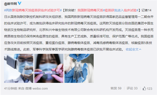另外一种疫苗则是国药集团中国生物武汉生物制品研究所、北京科兴中维生物技术有限公司联合有关科研机构开发的灭活疫苗,直接进入了I、II期合并临床试验。