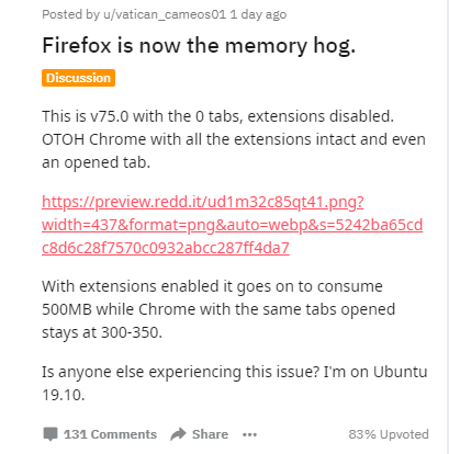 长期以来,Google Chrome 一直被用户吐槽是系统内存资源的消耗大户,因而系统资源占用较低的 Mozilla Firefox,便成为了许多人的首选替代浏览器。然而近日有网友在 Reddit 开帖吐槽称,新版 Mozilla Firefox 对内存资源的饥渴程度,已经超越了 Google Chrome 。