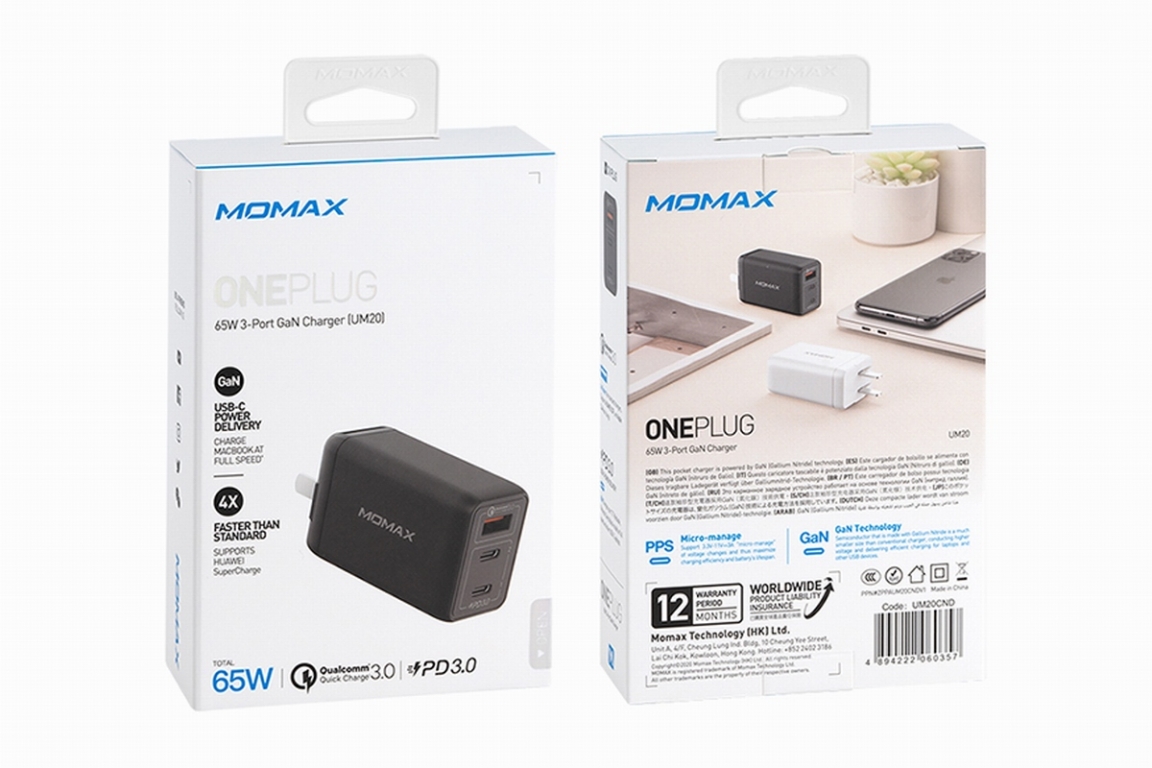 MOMAX 65W氮化镓充电器支持100-240V 50/60Hz全球电压,采用可折叠两脚插脚设计,收纳起来不会与行李刮蹭方便用户出门使用。