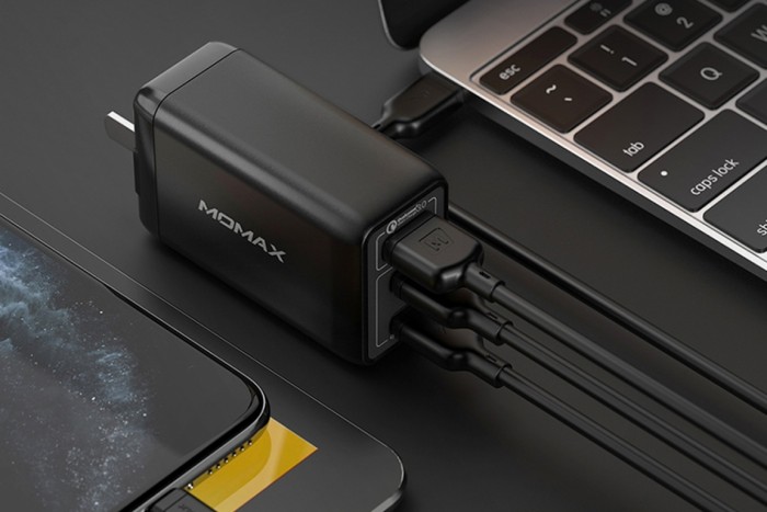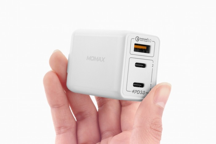 MOMAX氮化镓充电器拥有三个输出口,分别是两个USB-C输出接口、一个USB-A输出接口,可以同时为三台设备充电。