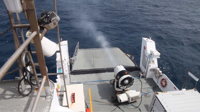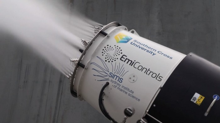 由悉尼海洋科学研究所和南十字大学的科学家领导的研究小组就带着人工增雨的原型涡轮机来到大堡礁的水域进行了一些小规模测试。它们的工作原理是向空气中喷洒微小的海水水滴,蒸发后留下纳米级的海盐晶体作为更明亮、更反光的云种子。