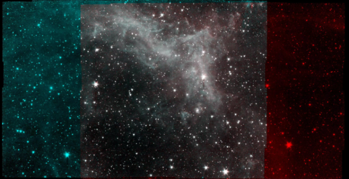 而在斯皮策太空望远镜拍摄到的加州星云图像中,两侧的红色和蓝色带代表两种不同波长的光,而灰色区域显示了两种波长。