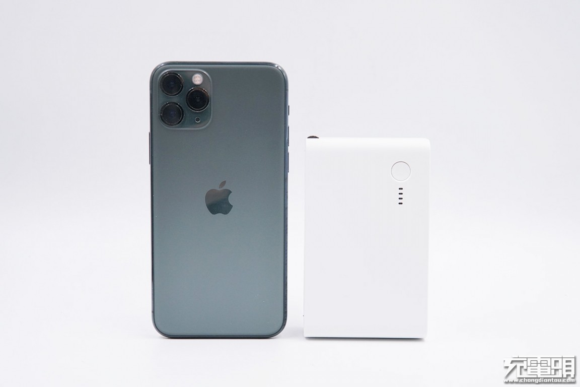 那么这样的一款内置氮化镓技术的双模移动电源体积有多小的,将它和iPhone 11 Pro放在一起比较,可以更直观的看出,整个产品的长度大致相当于手机长度的三分之二,这样的大小可以说控制的非常不错,正是因为氮化镓技术的加入,才使得其在体积外形方面更有优势。