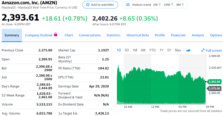 疫情期间,亚马逊股价上涨势头明显,但摩根士丹利认为,这一势头可能会放缓、停止。虽然总体上仍然看多亚马逊,摩根士丹利星期一发表投资报告称,禁足令对亚马逊股价的推动作用“基本上已完全显示出来”,建议投资者“落袋为安”。星期一常规交易中,亚马逊股价上涨18.61美元,涨幅为0.78%,报收于2393.61美元。尽管各大股指纷纷下跌,今年以来亚马逊股价却逆市上涨约27%。由于消费者纷纷通过网购购买生活必需品,亚马逊股价是禁足令的主要受益者之一。摩根士丹利指出,亚马逊股价超过目标股价,已被从Fresh Money清单中移出。华尔街分析师长期看多亚马逊,认为疫情过后其电商和云服务将更强大。但这并非意味着亚马逊发布第一季度财报时投资者不会面临风险。上周,瑞穗证券分析师詹姆士·李(James Lee)将亚马逊目标股价由2350美元下调至2300美元,称其日趋增长的高利润广告业务会受到疫情影响,今年的增速将由此前预期的40%下降到28%。