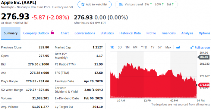 投资公司Loop Capital分析师阿南达·巴鲁阿(Ananda Baruah)星期一发表投资报告,维持对苹果股票的“持有”评级,但把目标股价由320美元下调至280美元。星期一常规交易中,苹果股价下跌5.87美元,跌幅为2.08%,报收于276.93美元。巴鲁阿还下调了对苹果的多项预期。他把3月份季度iPhone销量预期由4100万部下调至3700万部,对3月份季度营收预期为548亿美元,与华尔街一致。巴鲁阿还认为,苹果毛利率也将面临下调压力,原因是iPhone、维修等利润率更高的业务受到冲击。他指出,这是自iPhone普及以来其销售首次面临经济不景气的压力。巴鲁阿还担忧苹果估值,苹果估值由高点时的23倍下跌至当前的21倍,当前的估值“考虑了今年剩下时间和几乎明年全年的业绩预期”。2月7日,苹果因疫情影响下调了3月份季度业绩预期,当时受疫情影响的主要是中国业务。目前,美欧受到了很大影响,投资者对苹果的担忧由供应链转变为需求,许多消费者都因疫情失业或休无薪假,不大可能有资金购买高端智能手机。