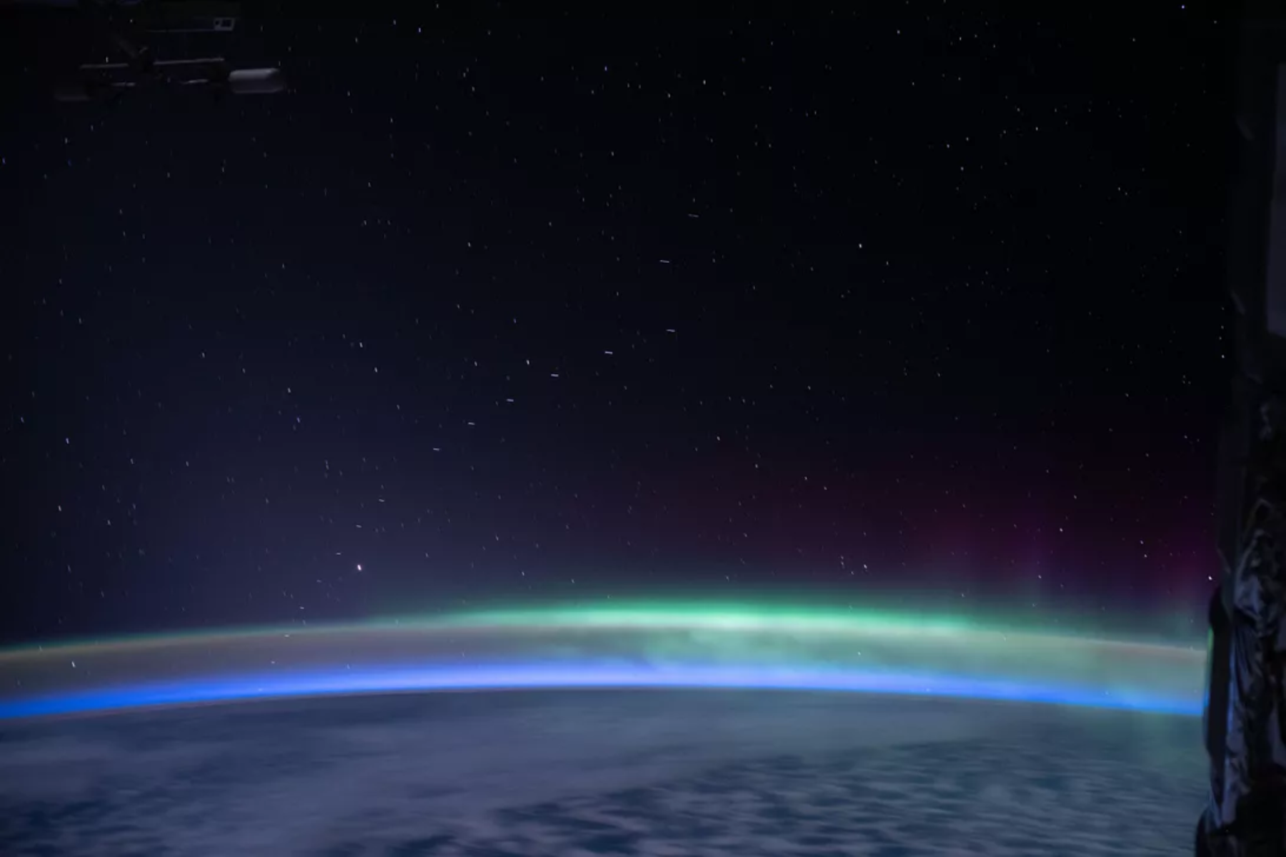 上面这张照片则是ISS在4月13日拍摄的,并通过NASA的宇航员地球摄影数据库分享出来。照片展示了明亮的绿色南极光,它是从印度洋上空某处的有利位置拍摄而成。