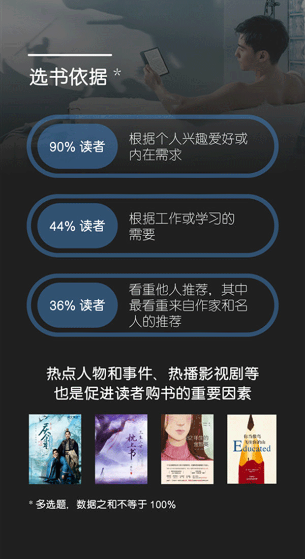 其中,94%的读者会根据个人兴趣爱好或内在需求选择阅读的书籍,44%的读者会根据工作或学习的需要选择书籍,36%的读者比较看重他人推荐,最看重来自作家和名人的推荐。另外,热点人物和事件、热播影视剧等也是促进读者购书的重要因素。