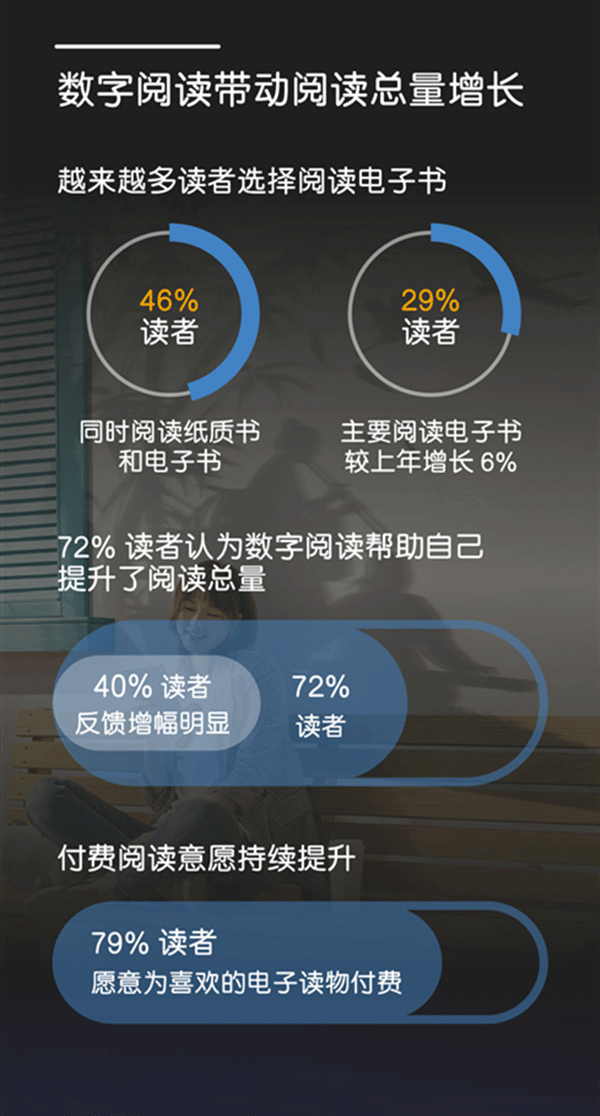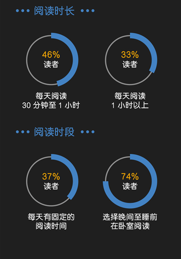 另外,根据亚马逊中国发布的2020全民阅读报告,我们可以知道有48%的成年读者年阅读量在10本以上,94%的成年读者年阅读量在3本以上;46%的读者每天会阅读30分钟至1小时,33%的读者每天的阅读时间在1个小时以上;37%的读者每天有固定的阅读时间,74%的读者选择在晚间至睡前读书。