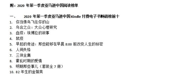 2020年第一季度亚马逊中国Kindle付费电子书畅销榜前十