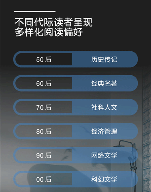 对于大家的阅读偏好,不同的年龄阶段喜欢阅读的书籍类型也各不相同。根据报告,50后喜欢阅读历史传记,60后喜欢阅读经典名著,70后喜欢社科人文,80后喜欢经济管理,90后喜欢网络文学,00后喜欢科幻文学。