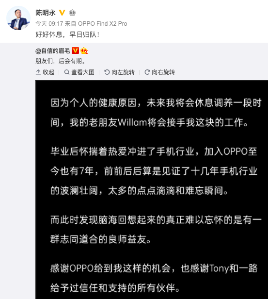 在微博上,沈义人也在其账号 "自信的眉毛" 上发布声明,称自己因为个人健康原因,未来将休息调养一段时间,并对 OPPO CEO 陈明永(Tony)和伙伴们表示感谢。