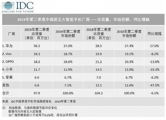 根据 IDC 发布的国内智能手机市场相关数据,OPPO 在 2018 Q4、2019 Q1 和 2019 Q2 等三个季度的市场份额分别为 19.6%、19.1% 和 18.6%,有逐步下降之趋势。不仅如此,另外,在同比的改变幅度上,OPPO 智能手机业务在这三个季度的增长率分别是 -3%、-4% 和 -13.9%。