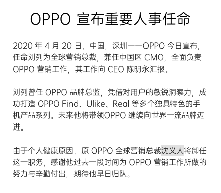 4 月 20 日,OPPO 在官网宣布了重要的人事任命。