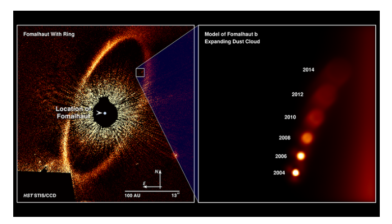 然而数年后Fomalhaut b却消失了。在大约十年的哈勃观测中,Fomalhaut b作为一个明亮的移动点清晰可见,但到了2014年,它在可见光和红外中已经无法探测到,这让天文学家们困惑不已。它就这样消失了。
