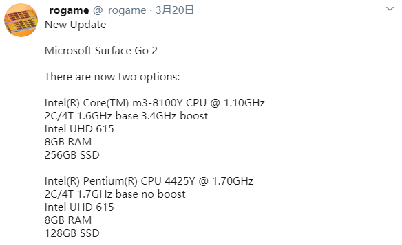 除了屏幕尺寸,Bowden 还透露 Surface Go 2 的分辨率也将升级到 1920×1280(像素密度 220 PPI),较去年的 1800×1200(像素密度 217 PPI)有所提升。