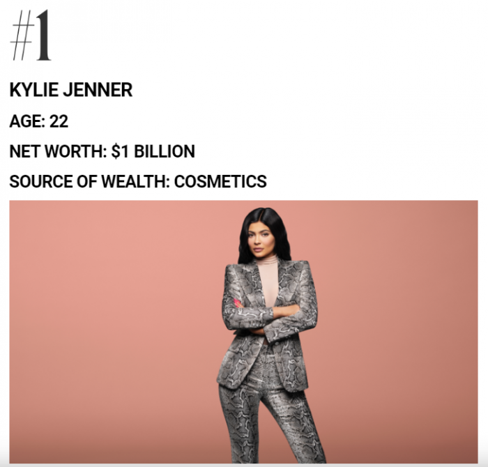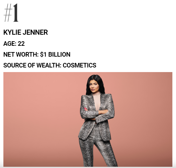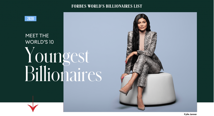 近日福布斯中国选出的名单显示,2020年全球最年轻10大亿万富翁中,第一名就是凯莉·詹娜,22岁的她已经身家10亿美元,身为网红的她很知道如何利用自己的优势,其财富的主要来源是化妆品,去年11月,她签署了一项协议,将Kylie Cosmetics 51%的股权作价6亿美元出售给了美容业巨头科蒂公司。