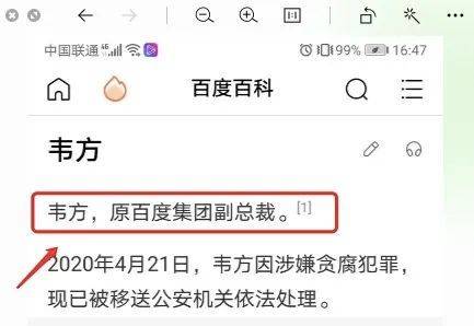 通告称,韦方利用职务之便侵占公司财产,涉嫌贪腐犯罪,现已被移送公安机关依法处理。而百度百科词条已经火速将韦方改成了“原百度集团副总裁”。
