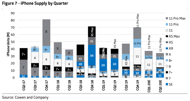 最近推出的iPhone SE将获得比此前Cowen预期的更多订单,该公司已将该机型的季度出货量预测从400万部上调至600万部。而对于2020年整体而言,iPhone SE的销量显然有望达到2500万部。对于iPhone 12系列,供应链检消息显示,所有机型都将支持5G连接,在产品路线图上可能会出现分裂,其中 "Pro "和 "Max "机型将提供mmWave支持,而其他机型则不支持。