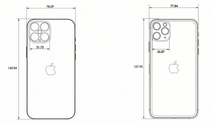 iPhone 12 Pro Max 因方块状设计宽度较 iPhone 11 Pro Max 增加了 0.2 mm,机身长度增加近 3 mm。变化最大的是摄像头模组,由于 LiDAR 传感器的加入使得镜头模组长宽均增大了近 5 mm。EAP 随后补充,各镜头位置和大小参数还不完全准确,但总体设计布局可以 100% 确定。