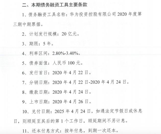 华为计划发行20亿元中期票据 利率区间2.8%-3.4%